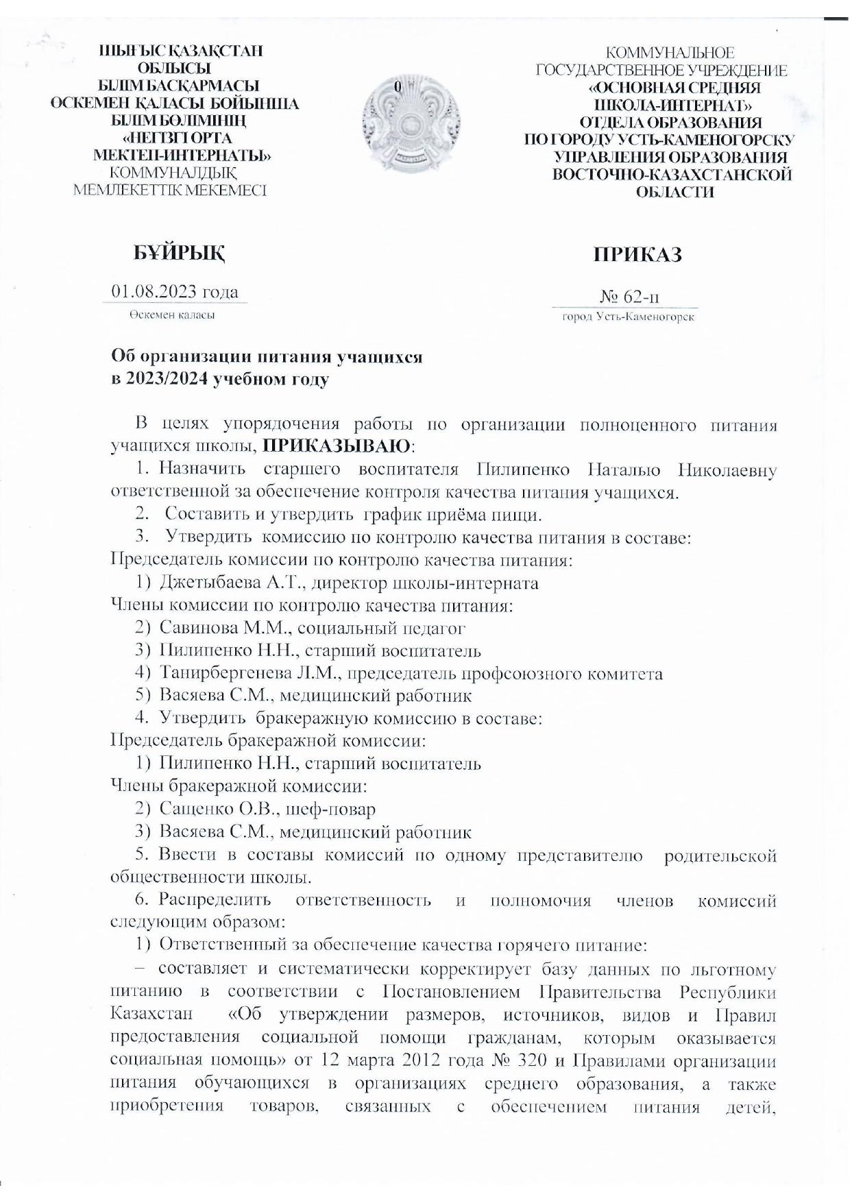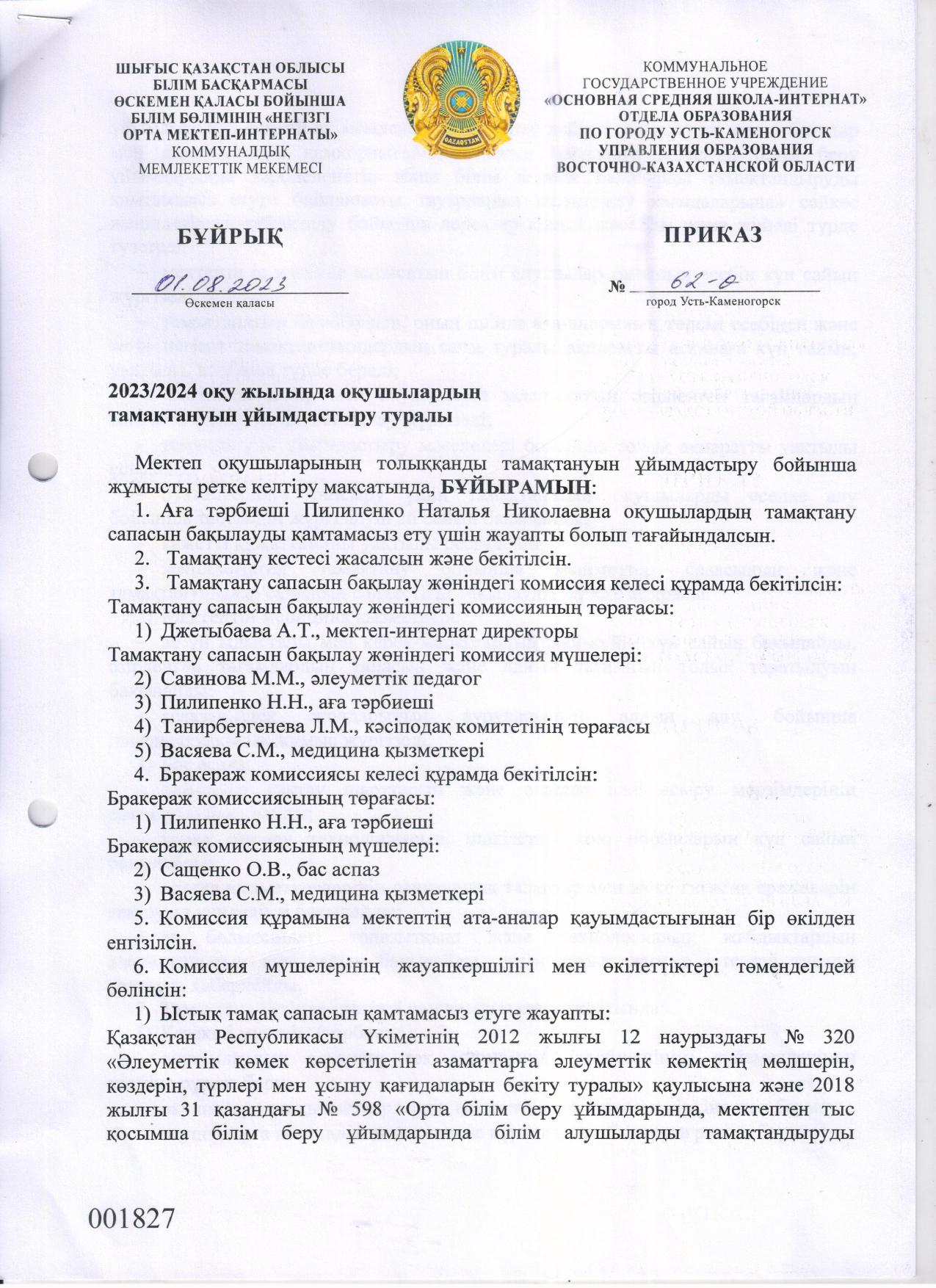 01 тамыз 2023 0 1 2 3 4 5 2023-2024 оқу жылынада оқушылардың тамақтарын ұйымдастыру туралы бұйрық. Приказ об организации питания учащихся в 2023-2024 учебном году.